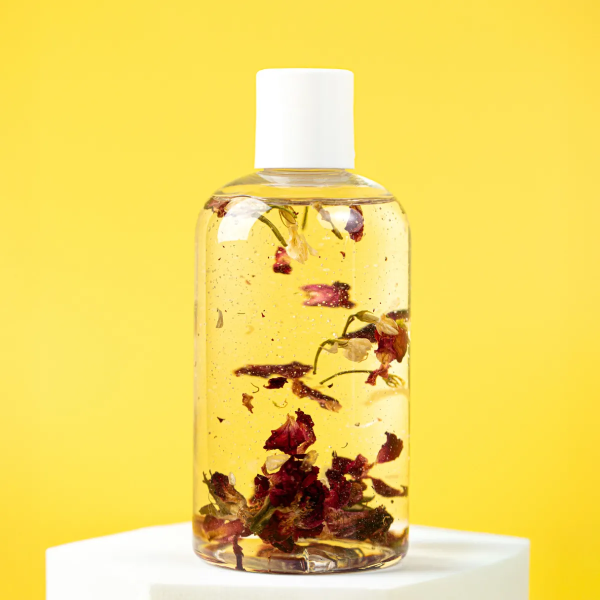 - To each of your bottles, add 3 grams of the dried roses. If needed, break up the hibiscus into smaller pieces.